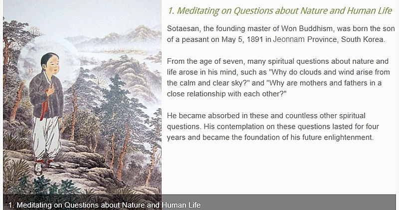 Park, Joongbin (1891~1943), better known as Sotaesan, was born the son of peasants on May 5, 1891 in Korea. His spiritual journey started with questions about natural phenomenon and human relationships. His determination to find answers to these questions eventually led to his great awakening on April 28, 1916.